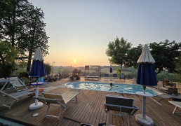 Le camere sono 3: una ampia suite padronale e due stanze; tutte con vista e servizi interni. Sono fruibili le grandi zone comuni, con un soggiorno e un patio esterno attrezzato con tavolo, sedie e un angolo barbecue a disposizione degli ospiti.Nel giardino sono disponibili due vasche idromassaggio da 5 posti ciascuna, due piscine esterne a disposizione degli ospiti e un laghetto romantico con ninfee e panchine. Il b&b è aperto tutto l'anno ed è equipaggiato di riscaldamento e impianti di aria condizionata nelle camere.